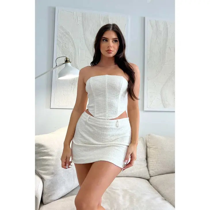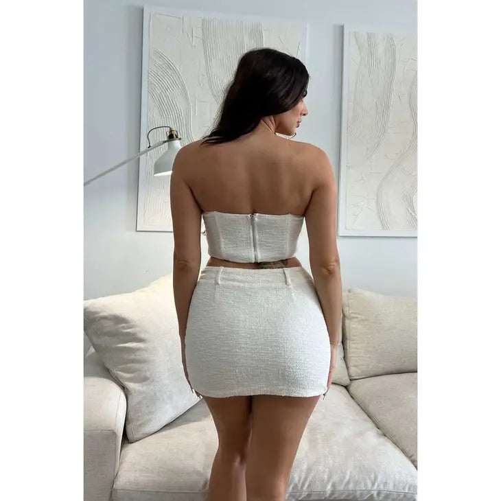 Our two piece Evi Skirt Set is perfect for summer! This form fitting set consists of a skirt and corset top in a unique tweed material for a look that's perfect for any summer soiree.